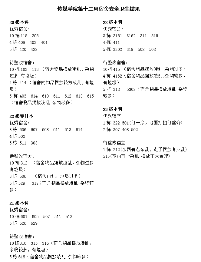 辅导员们在查寝过程中提醒同学们注意用水用电安全,再次强调了公司本科教育评估期间的纪律要求,同时关心同学们的学习计划和学习态度。bevictor韦德国际本周查寝结果公示如下: