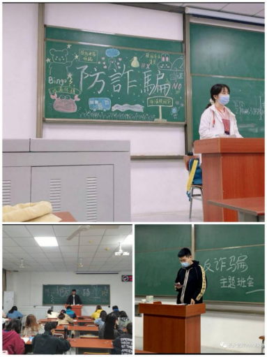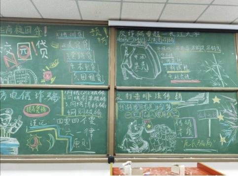 本次主题宣传活动以班级为单位,采用幻灯片、视频案例、讨论交流和黑板报等多种形式相结合,生动有趣地向同学们普及了网络诈骗的多种形式,让同学们了解到了诸如冒充司法机关工作人员、熟人、虚假中奖信息、贷款信息、网络购物等常见的电信网络诈骗犯罪手段。同时也有针对性地提出了多种防范措施,从思想上提高警惕,防止上当受骗。