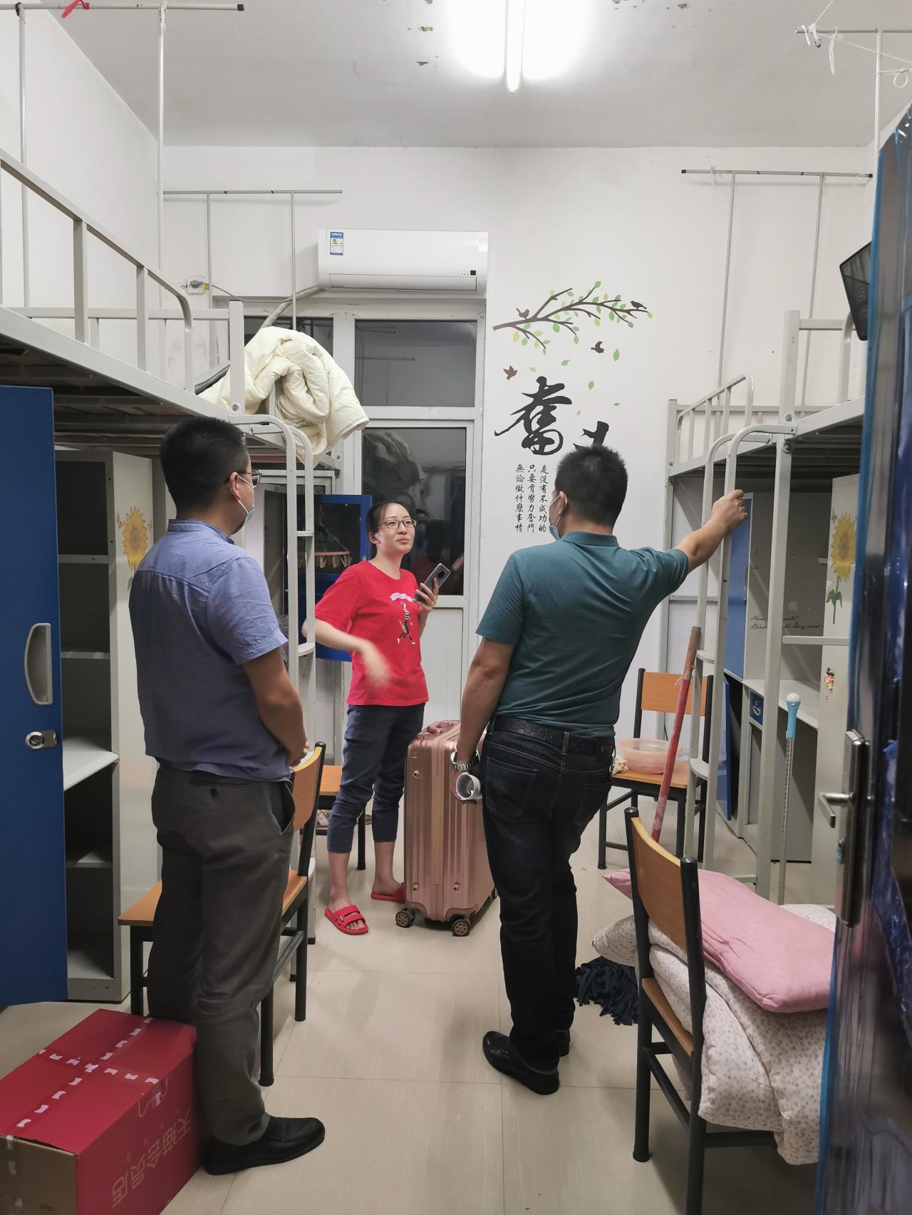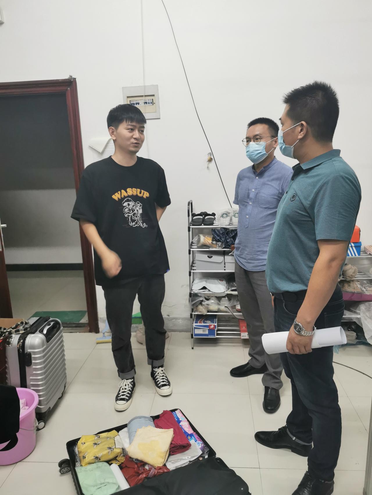 在员工宿舍,院领导关心慰问到校生的床被换洗和晾晒情况,深入了解员工疫情和假期期间的学习或工作经历,以及对于即将开展的寝室搬迁工作的计划与困难,同时,也与同学们就疫情常态化下的学习与生活形式进行了交流,希望大家严格遵守并执行省市、公司及武汉校区关于校园管控的相关规定与要求,全面做好秋季开学后的身心准备。
