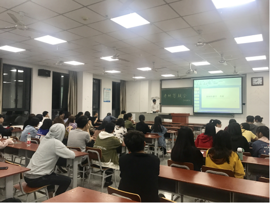 答疑会开始,主持人赵湘介绍此次会议的到场嘉宾及会议流程。紧接着,辅导员赵湘从考研目的、选择院校和专业、参考书目、复习方法以及心态调整等方面向大家介绍了考研的基本信息,希望同学们可以端正心态,树立信心,合理规划。她说:“考研不是唯一的选择,但是选择了就不要后悔。”