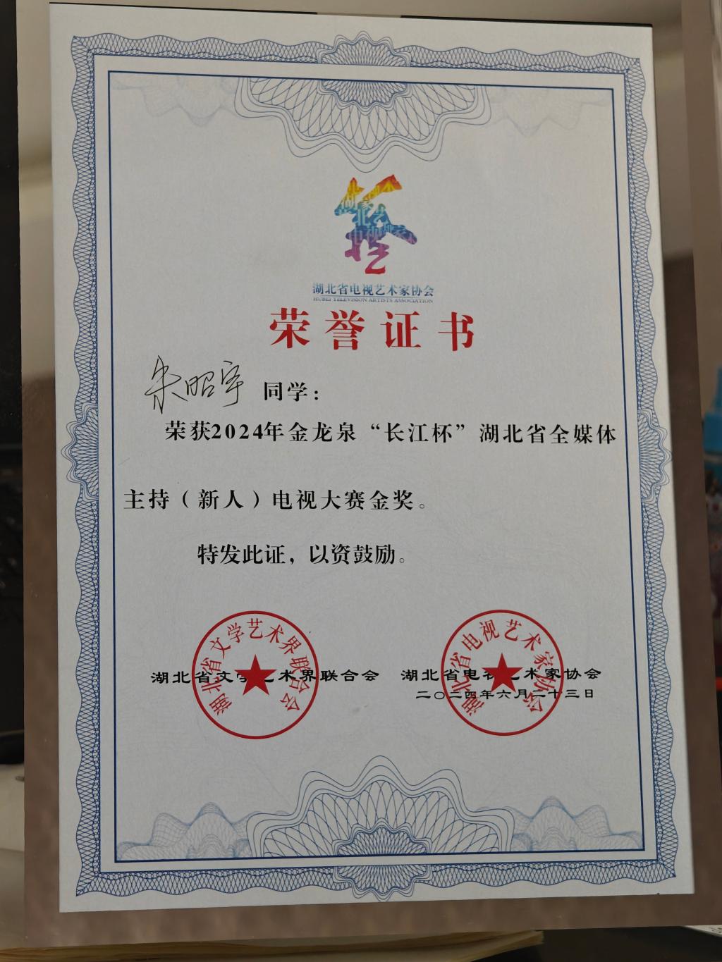 朱昭宇同学荣获“长江杯”湖北省全媒体主持新人大赛金奖