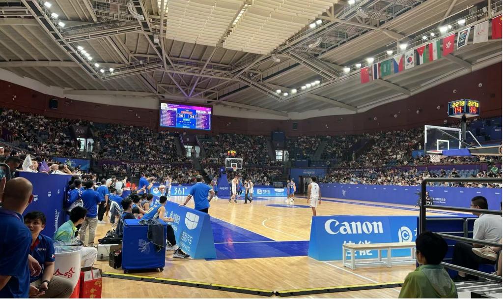 本次杭州亚运会男子篮球项目在杭州奥体中心和浙江大学紫金港校区体育馆展开,其中浙大馆共进行22场比赛,中英文评论员许健主要负责现场MC互动、球队入场仪式主持、比赛信息播报等工作,作为体育展示工作的重要一环,在场边技术席用中英文向运动员及观众传递正确比赛信息,并在暂停时间、中场休息时刻与观众进行互动,营造热烈的比赛氛围。