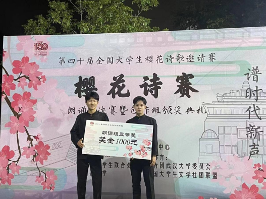 (通讯员:黄冬媛)2023年5月28日晚,第四十届全国老员工樱花诗歌邀请赛朗诵组决赛在武汉大学展开角逐,公司播音专业杨晟、陈正毅同学一路披荆斩棘在决赛中取得三等奖的好成绩,并荣获奖金1000元。