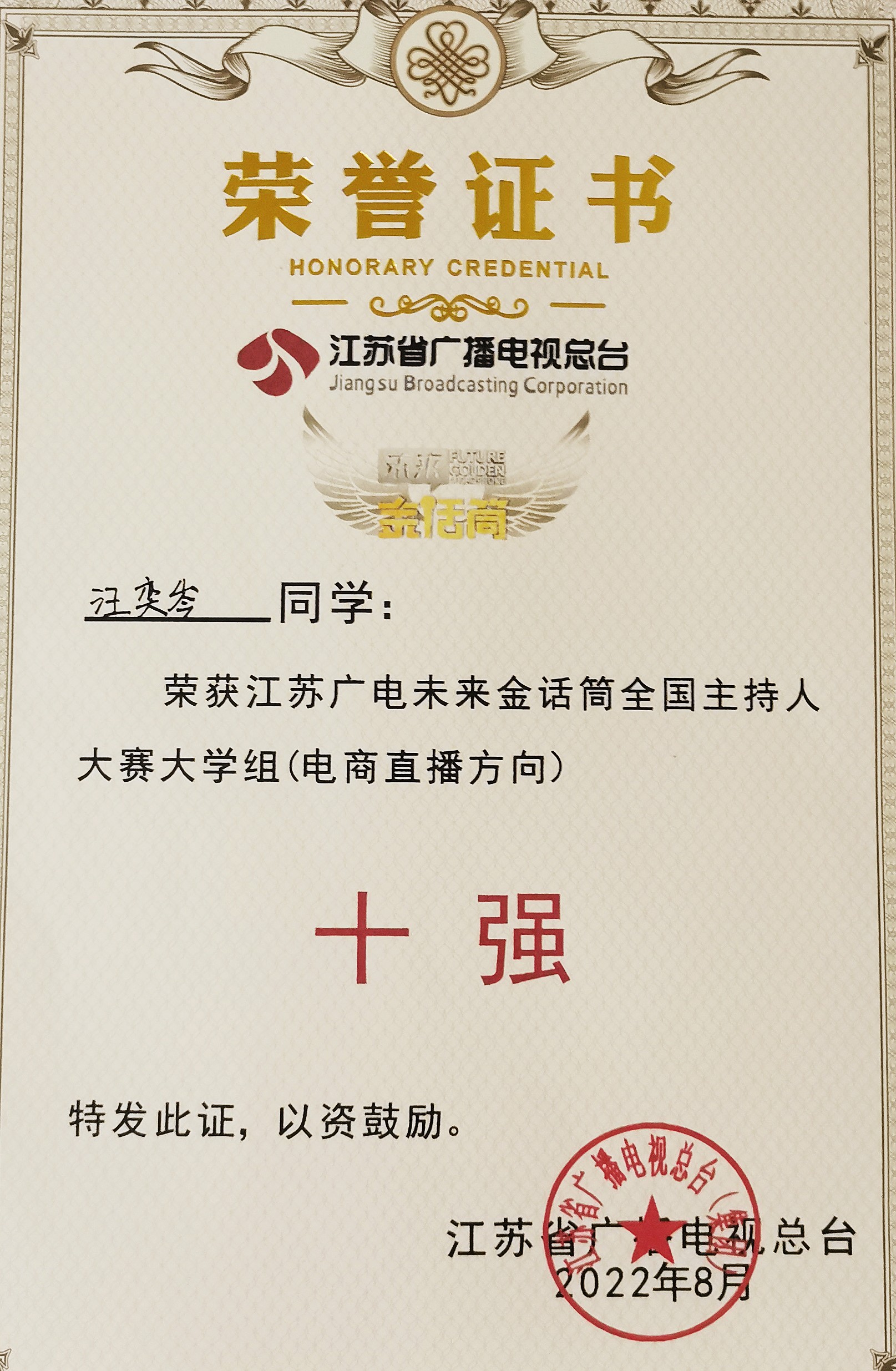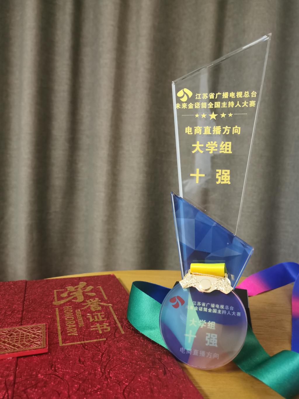 (通讯员:蔡凌楚)近日,由江苏广电主办的第九届《未来金话筒》全国主持人大赛决赛在南京圆满落下帷幕。公司2019级播音与主持艺术专业员工汪奕岑荣获全国十强,2020级播音与主持艺术专业员工朱昭宇也在全国总决赛中亮相,并取得不俗成绩。