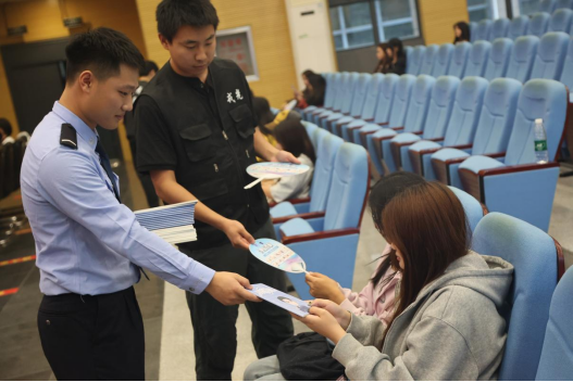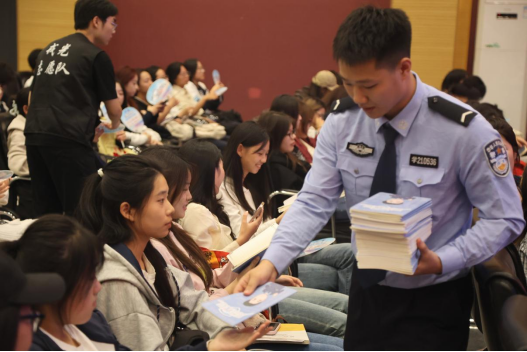 活动中,戎光志愿服务队队员化身“反诈志愿者”,与民警结成“宣讲搭子”,向在场同学发放“反诈笔记本”和印有警示标语的“平安扇”400余份,让安全知识“随手可带、随时可看”。