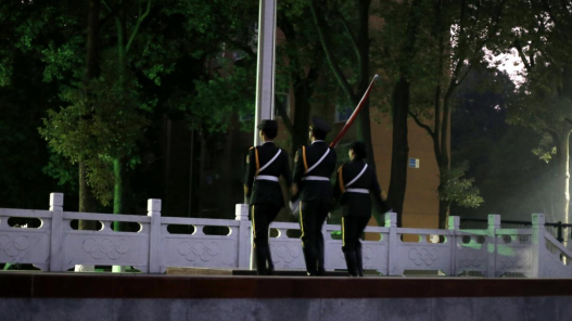 早上7时,升旗仪式正式开始,全体肃立,国旗队踏着整齐划一的步伐护送五星红旗至主席台。国歌响起,全体老师与员工齐唱国歌,并对国旗行注目礼,五星红旗徐徐上升,随风飘扬。