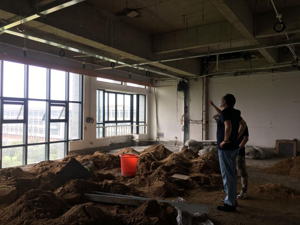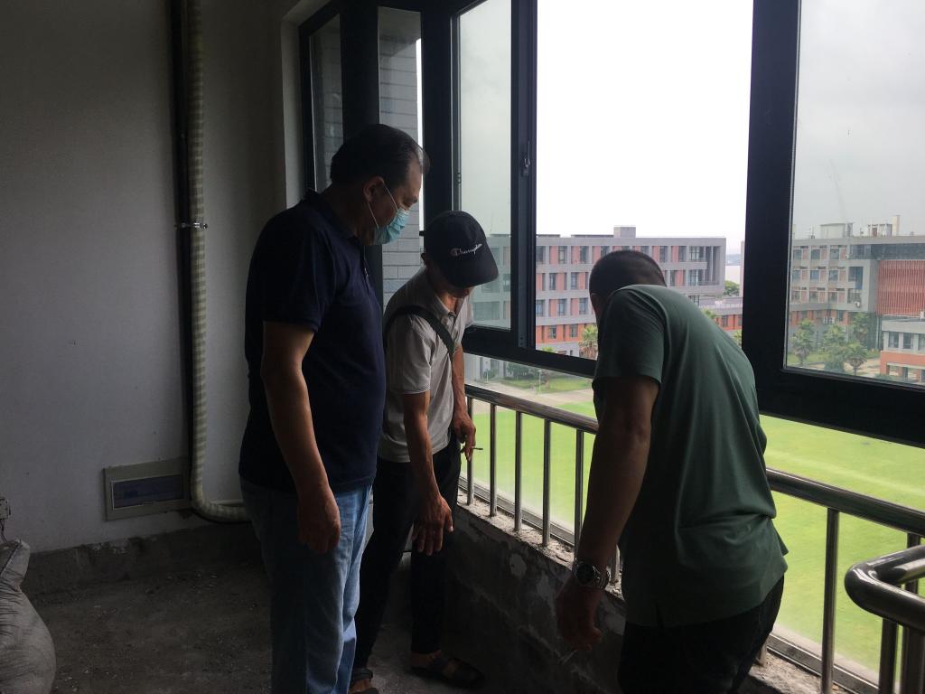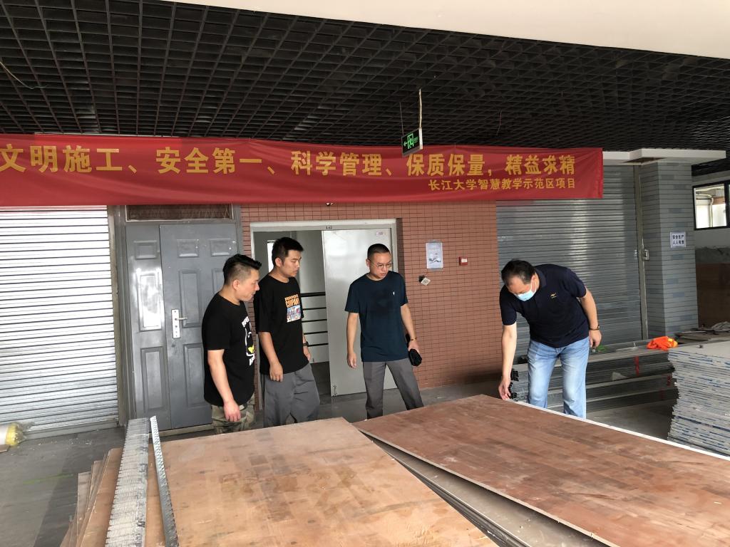 (通讯员:郑瑞丰)2021年7月19日上午十点,公司党委书记邹火明、副经理郑瑞丰、综合办主任刘武洋以及武汉校区维修管理中心郭辉科长一行检查公司智慧教室工程建设,检查大雨过后有无新增漏水点、文明安全施工等情况,强调工程建设要确保安全、质量、进度。