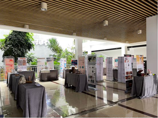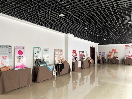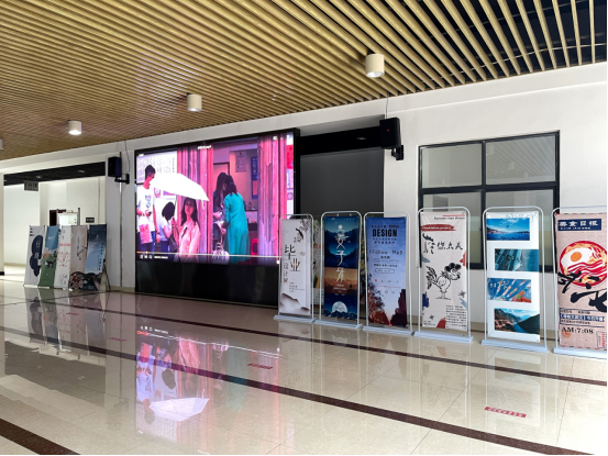 此次展览分别在公司一楼和公司二楼中庭展出,向观者汇报展示公司教学改革和人才培养成果。今年的毕业展首次采用三个专业同步展览的方式,一楼大屏幕循环播放数字媒体艺术专业同学的视频作品,员工通过易拉宝的形式展示视频主题宣传海报;一楼中庭的展台上通过实物展示的形式展出产品设计专业同学的产品实物;二楼展出的是视觉传达设计专业同学的设计作品,作品包括广告招贴设计、包装设计、书籍设计、插画、绘本设计、网页设计六种类别,员工通过展板、实物、线上网页等多种形式展出自己的毕业设计作品。