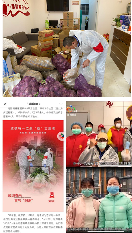 刘万同学作为一名在汉老员工,一直以来在龙阳新村社区担任志愿者,全程参与分发爱心菜、代购储备肉、排查体温、关爱老人等志愿服务工作。工作之余,在抗疫一线边做服务,边上网课的同时,刘万与姜汶耽同学联手,发挥专业特长,创作专业作品,决定拍摄纪录片《龙阳战“疫”》,见证抗疫战友们工作的点点滴滴。在公司陈思琦老师的指导帮助下,他俩充分结合现场播报、新闻采编、音视频剪辑等播音、广编专业技能,在只有手机、稳定器等简单拍摄器材的有限条件下,白天拍摄素材,晚上商讨剧本,赶制作品。通过2周的素材拍摄与后期制作,完成了《龙阳战“疫”》纪录片。