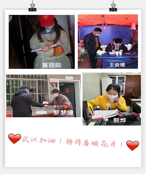 【宣传之星】田珊鸿,韦德官方网站艺术与bevictor韦德国际广编31902班员工,现任院员工会体育部成员。志愿服务地点:湖北省恩施州宣恩县李家河镇司城村。疫情期间,她听说村里正在征集抗疫志愿者,她便义无反顾地参加志愿者活动,定期入户向村民普及防疫安全知识,每天为村里涉汉人员进行体温测量及数据登记上报等工作。没有一个冬天不会过去,没有一个春天不会到来。相信不久山河无恙,万物皆安。武汉加油!中国加油!”