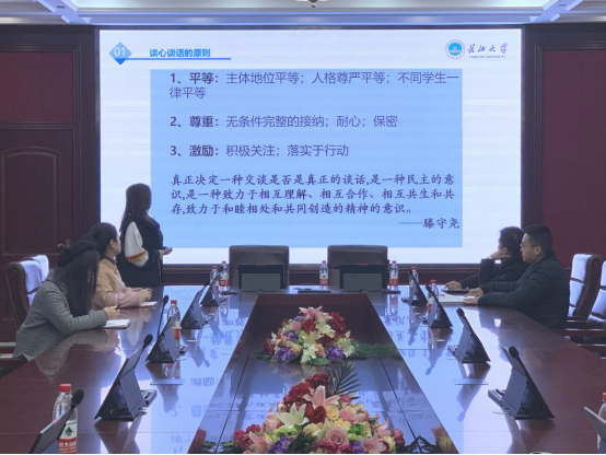 赵湘从谈心谈话的原则、谈心谈话的准备、谈心谈话的过程、谈心谈话的应用和典型案例的讲解五个方面阐述了谈心谈话的重要性及策略。最后她要求大家坚持育心和育德相结合,把辅导员谈心谈话作为人文关怀和心理疏导的重要方式,使之成为发现和研判心理问题,维护心理健康的第一道屏障。