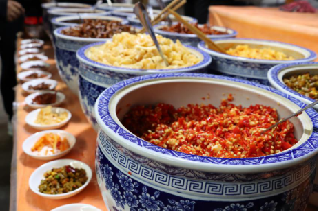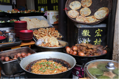 当地村民在自家门前摆着小摊,叫卖着当地特产