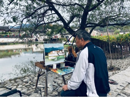 宏村南湖湖边,聚集了各地写生艺术家在此创作