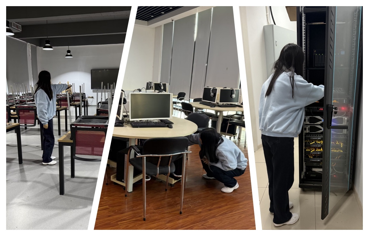 占雨秀老师对苹果机房、综合设计实验室、手绘室进行了全方位检查,重点排查了电脑硬件、系统与软件、网络、供电及外设的运行状态,并确保工作台整洁、无杂物堆积,以保障操作安全。