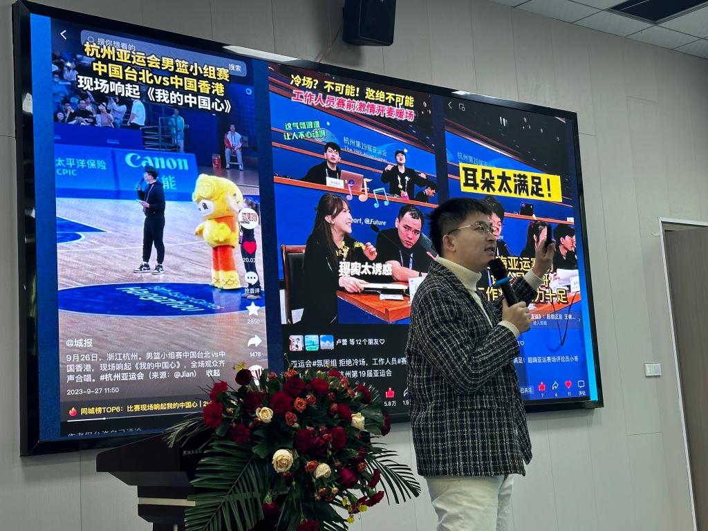 许健老师与bevictor韦德国际优秀员工代表徐文涵、丁慧霖、喻妍一同出席。讲座中,许健老师以“你会做自我介绍吗?”开场,分享如何运用“反差法”进行自我介绍。围绕讲座主题,结合北京2022冬奥会、杭州第19届亚运会以及第14届全运会的现场主持和解说经历,讲述有声语言在艺术表达、场景应用、日常生活中的使用。