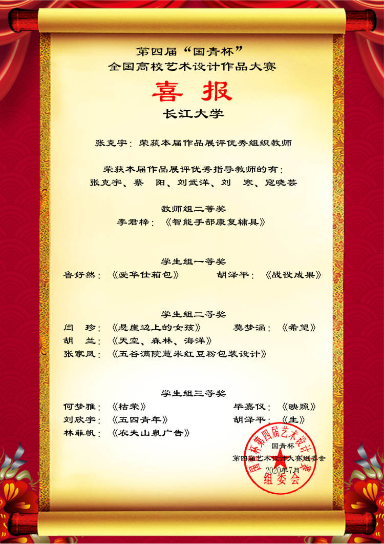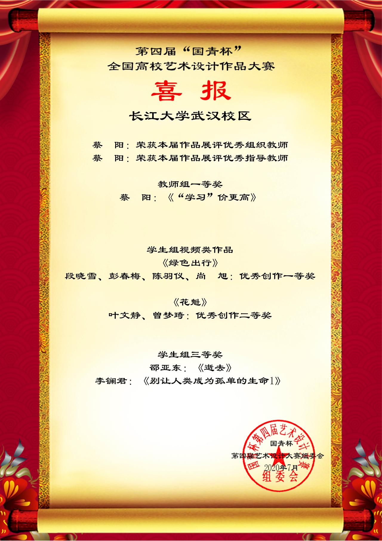艺术与bevictor韦德国际为了推动内涵式发展,秉着“以赛促教、以赛促学”的主旨,积极组织参加第四届“国青杯”艺术设计大赛。赛前,公司积极准备,老师们认真指导,师生们专心创作,最后经过遴选,将优秀作品推送大赛评审。日前,公司接到“国青杯”喜报,本次共获员工组一等奖3名、二等奖5名、三等奖7名的好成绩,蔡阳老师获得教师组一等奖,李君梓老师获得教师组二等奖,蔡阳、张克宇老师荣获本届作品展评优秀组织教师,张克宇、蔡阳、刘武洋、刘寒、寇晓芸老师获得本届作品展评优秀指导教师奖。