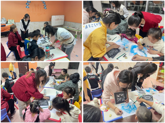 在绘画课现场,高老师为大家展示了苗族扎染作品,并详细引出此次绘画创作的主题,引导小朋友们充分发挥自己的想象力,制作一个属于自己的蜡染作品。在老师详细的介绍下,小朋友们开始了自己的创作之旅,完成了以“神奇蜡染—苗族的色彩魔法”为主题的作品。同时,高老师引导小朋友进行分享展示,并颁发奖励贴纸。在绘画课程结束时,有趣的教学方式深受家长和小朋友们的喜爱。