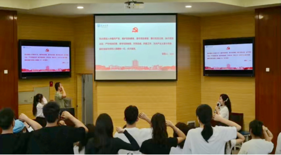 活动在庄严的国歌里拉开序幕,在响亮而有力的歌声中,坚定着党员同志们的初心。随后,在传媒公司党委委员樊凡老师的带领下,同志们紧握双拳,一声声铮铮誓言在耳边响起,每位党员都深刻回顾了入党之初许下的庄严承诺,心中的信仰与责任更加坚定着。