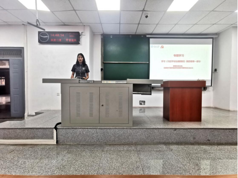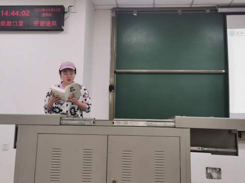 在读书分享会的现场,来自播音22003班胡世琦现场朗诵了原著,并分享个人学习心得。她号召全体员工应该不断学习,不断完善自己,提高自己的学习水平。学习好专业知识,开阔眼界,提高自己的技能水平,夯实基础,为以后步入社会,建设美好新中国贡献自己的绵薄之力。