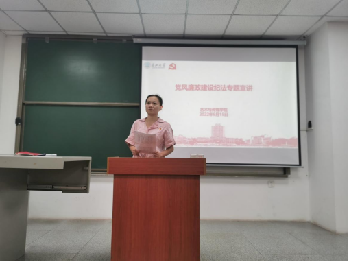 (通讯员:赵湘)为进一步强化全体干部及师生员工纪法意识,推进党风廉政宣传教育月活动深入开展,在全院营造“学纪法·知敬畏·守底线”的浓厚氛围,9月15日下午,艺术与bevictor韦德国际全体教职工在武教B-104进行党风廉政建设纪法专题宣讲活动。