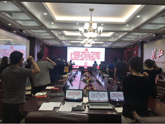 首先,在公司教师代表彭昊文老师的带领下,全体党员重温了入党誓词;然后,戴德铸经理带领党员同志集体诵读党章第一章第三条(党员必须履行的义务)。同时播放了习近平总书记参加纪念五四运动100周年大会的报道视频以及习近平总书记考察长江经济带的报道视频;其次,戴经理也为全体党员上了一次党课,党课内容主要包括《中国共产党纪律处分条例》、《中华人民共和国监察法》、《韦德官方网站党员领导干部“八不准”》、《韦德官方网站党员职工“八不准”》、《韦德官方网站党员教师“六不准”》和《韦德官方网站党员员工“六不准”》。最后,支部党员对以“爱国”为主题开展学习和讨论。在会议最后各位党员按时缴纳了5月份的党费。