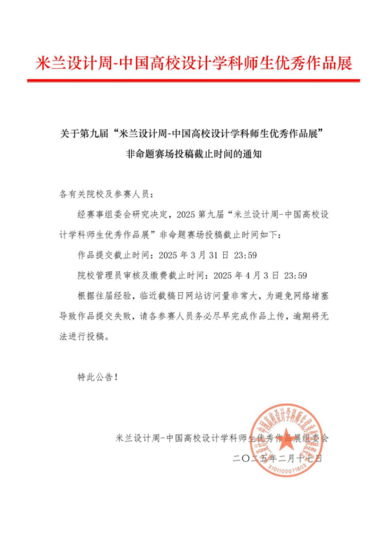 2025第九届“米兰设计周-中国高校设计学科师生优秀作品展”非命题赛场投稿截止时间如下: