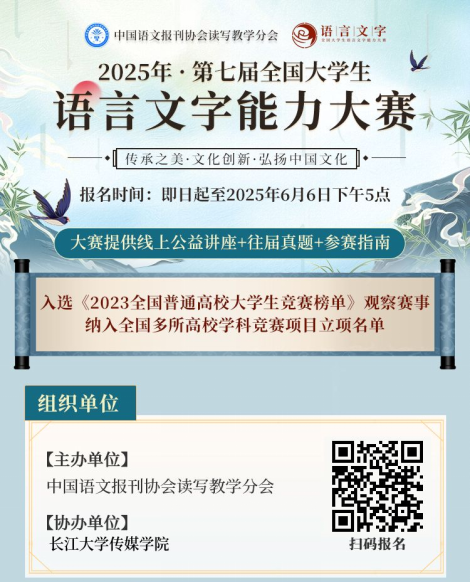 为贯彻落实《国家中长期教育改革和发展规划纲要》《中华人民共和国国家通用语言文字法》,测试老员工的语言文字知识和应用能力,弘扬中国文化,增强老员工规范使用国家通用语言文字的意识,促进语言文字教、学、测协调发展,在国家语委咨询委员等大赛专家顾问的指导下,中国语文报刊协会读写教学分会继续面向全国老员工举办“2025年第七届全国老员工语言文字能力大赛”,大赛每年一届,前六届大赛共有来自北京大学、同济大学和武汉大学等上千所高校老员工参与,获得了众多高校师生高度评价。同时,该项大赛已纳入中国高等教育学会发布的《全国普通高校学科竞赛排行榜》观察目录和众多高校竞赛榜单,也已纳入本校《韦德官方网站员工竞赛项目一览表(2025)》中,确定为C类比赛。为促进公司员工语言文字能力,大赛组委会决定由韦德官方网站传媒公司为赛事协办单位,负责组织武汉校区员工参加2025年第七届全国老员工语言文字能力大赛。