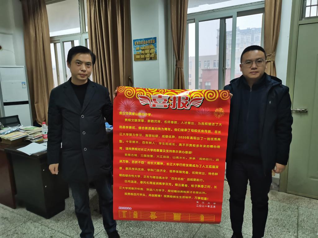 (通讯员:郑瑞丰)为了及时送达包片中学关于贵校优秀毕业生的喜报,加强互信,增进交流,3月26日下午,公司副经理郑瑞丰先后前往武汉市吴家山中学、吴家山第四中学等2所包片中学开展招生宣传走访工作,分别与高三年级主任杜俊、袁刚亲切交流。